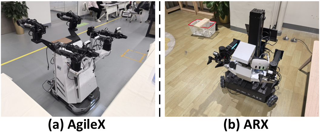 Collection platform of AgileX and ARX. We use a VR headset to control the ARK robot for data collection, and employ a slave arm to teleoperate the master arm for gathering the Agilex manipulation dataset.