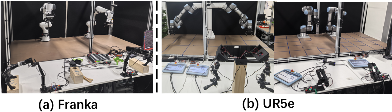 Collection platform of Franka and UR5e. Collect a robotic manipulation dataset by controlling the dual-arm system (Franka and UR5e) via HACTS.
