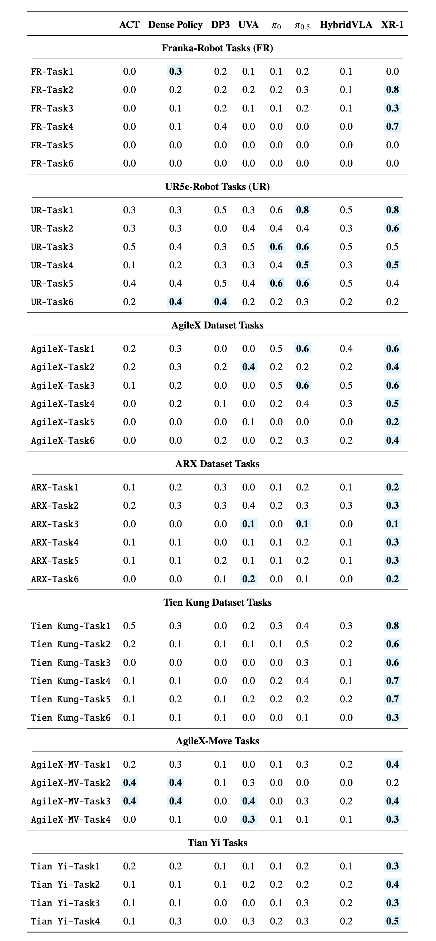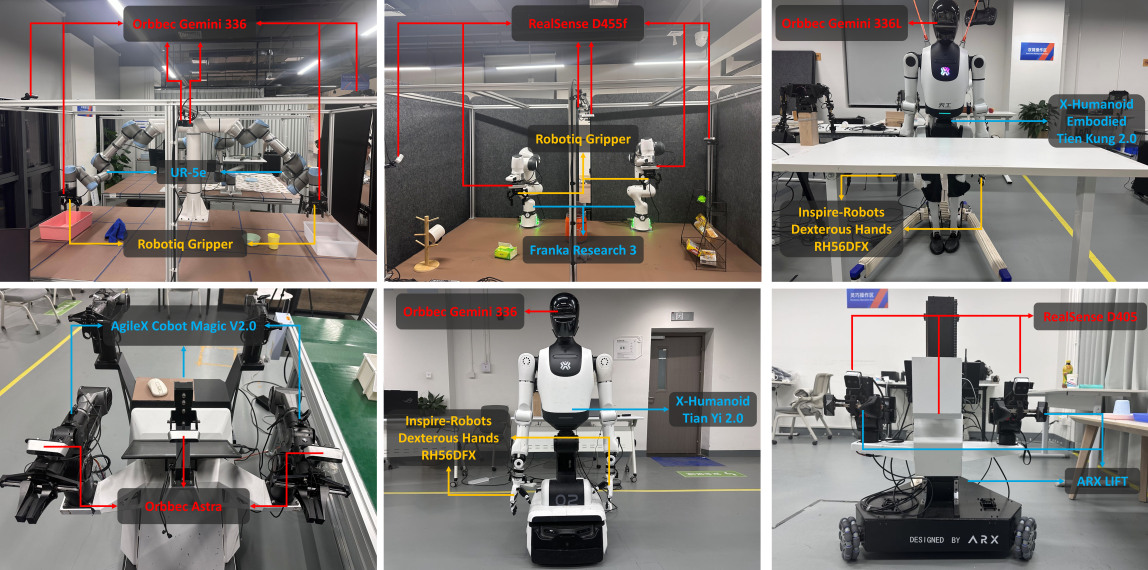Robotic real-world setup. For the Franka and UR5e robots, we use cameras positioned at the top, left, and right viewpoints to record the visual information of the task trajectories. For the humanoid (Tien Kung and Tian Yi) robots, we use their built-in RGB-D cameras to capture visual observations. For the AgileX and ARX robots, we use dual wrist-mounted cameras (one on each arm) as well as a head-mounted camera to capture visual information.