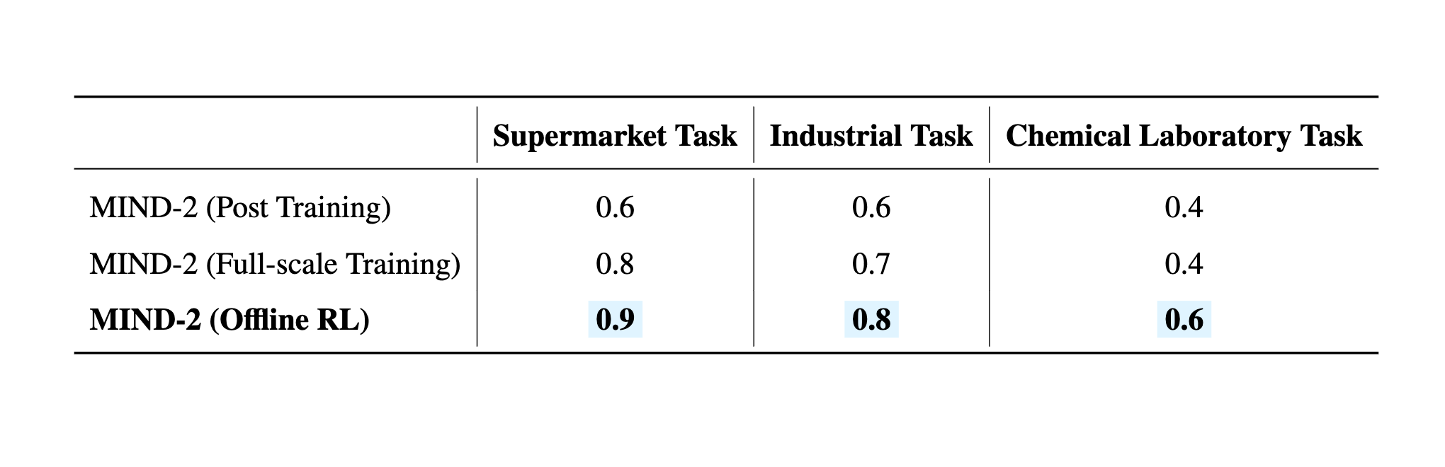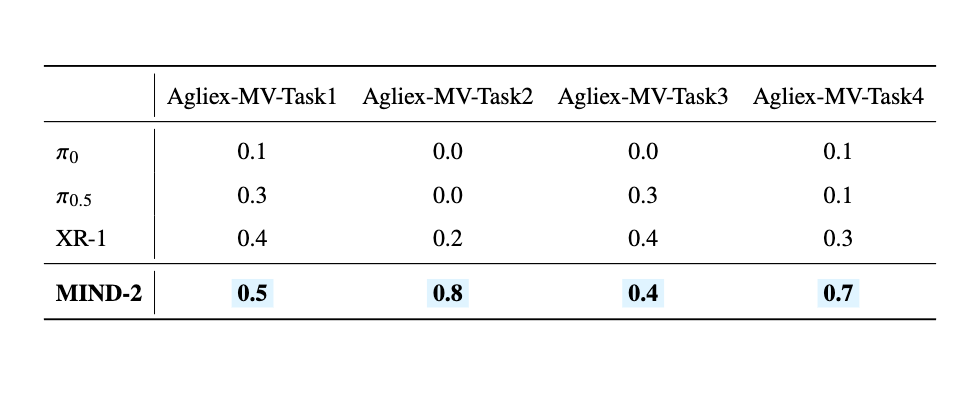 Success rates across three collaborative tasks. MIND-2 (Post Training) is instantiated by fine-tuning InternVL3 and pi0.5 directly on data from the three multi-robot collaboration tasks. MIND-2 (Full-scale Training) is first pretrained on the full-scale mobile manipulation dataset using a fast-slow system architecture, and then further fine-tuned via post-training on data from three multi-robot collaboration tasks. MIND-2 (Offline RL), after full-scale training, we apply Implicit Q-Learning (IQL) to conduct offline reinforcement learning on the MIND-2-VLA.