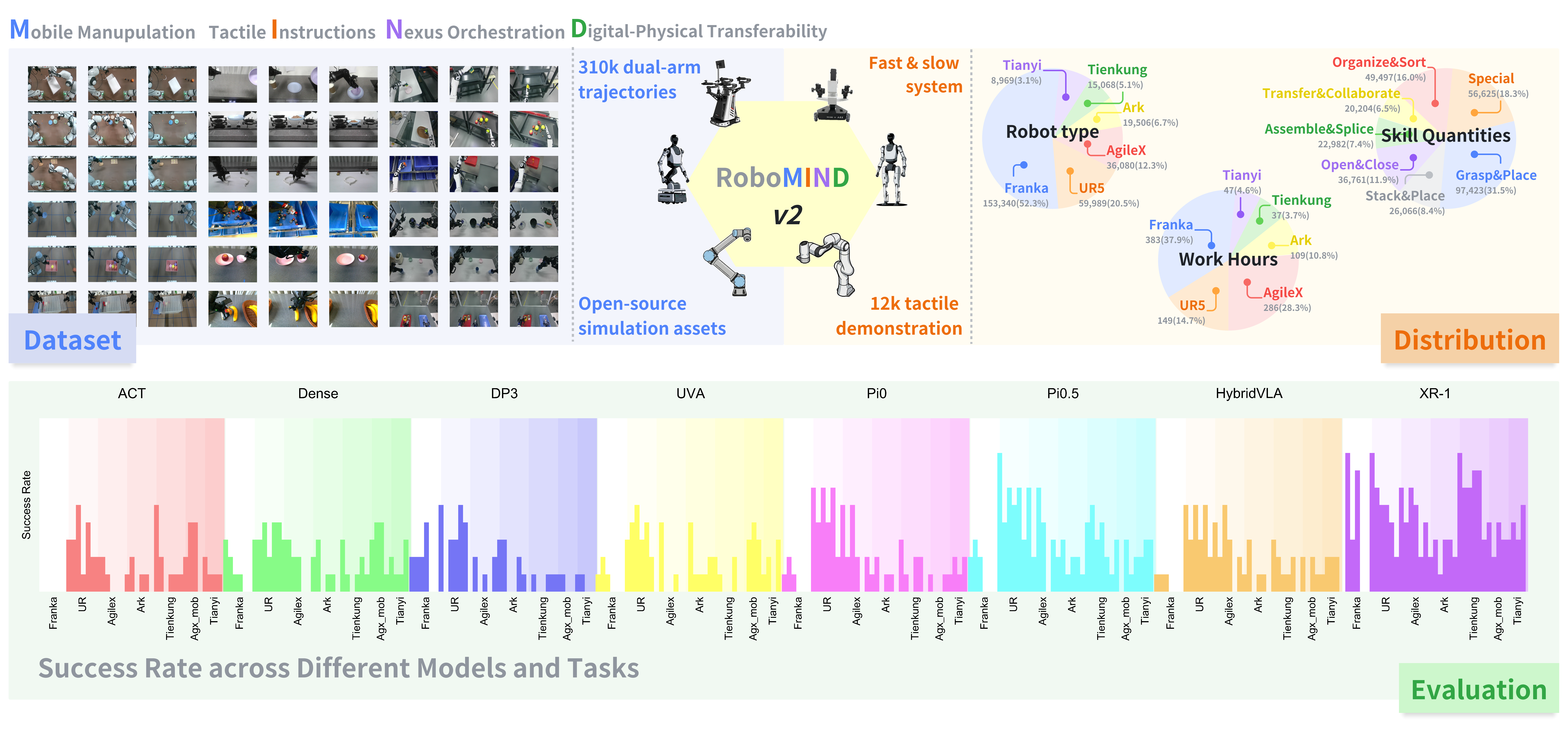 We introduce RoboMIND 2.0, a large-scale dataset comprising 310K dual-arm trajectories collected from six heterogeneous robot embodiments, totaling over 1,000 hours. The dataset features rich modalities, including 12K tactile-enriched sequences and 20K mobile manipulation trajectories. Collected through a unified teleoperation and quality assurance pipeline, RoboMIND 2.0 ensures consistent proprioception and provides fine-grained natural language annotations. To support scalable training and evaluation, we release digital-twin USD assets and 20K simulation trajectories aligned with real-world tasks. Building on this foundation, we propose MIND-2, a dual-system controller that integrates a slow high-level planner MIND-2-VLM with a fast low-level policy MIND-2-VLA, enabling robust long-horizon mobile manipulation across diverse scenarios.