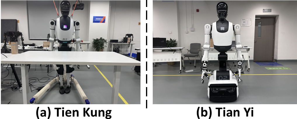 Collection platform of Tienkung and Tianyi. For the humanoid robot TienKung, data collectors will wear motion capture suits to record joint movements, which are then mapped to the robot to enable robotic manipulation. For the dual-arm mobile robot with a wheeled base Tian Yi, we collected datasets using two human operators.